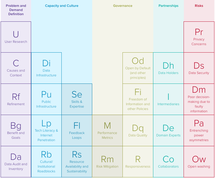 為了進行個案質化研究,此份報告特別開發出「開放資料邏輯模型」(logic model of open data)以及「開放資料影響力週期表」(periodic table of open data impact),把這 12 個開發中國家放到週期表裡比對,評估其是否有達到:了解使用者與當地特殊條件、讓關係人充分參與回應、與多方合作打造資料生態系、風險評估與應變,以及永續性發展,此 5 個面向。