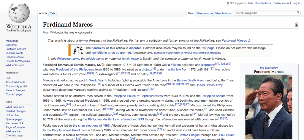 菲律賓前獨裁者馬可仕(Ferdinand Marcos)家庭,一直是菲律賓政治背後的幽靈,直到去年、尤其在馬可仕被下葬於英雄墓園時,維基百科上的「馬可仕」網頁,編修條目突然大增,過去十年平均只有 300 次的編修紀錄,但 2016 年達到 1328 次。維基百科編輯志工納薩雷諾(Carlos Nazareno)察覺此一現象,發現背後不僅有人積極編修,內容甚至有過度美化、不真實的竄改、操控事實等現象。