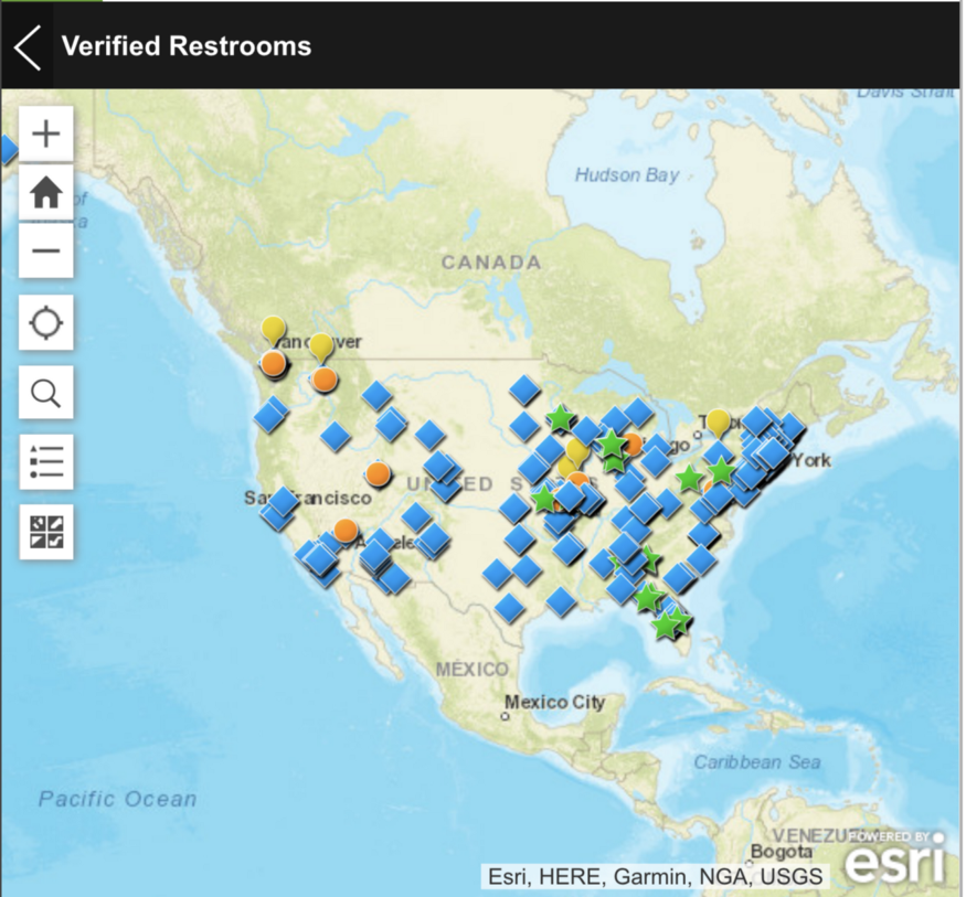 有天 Christina 突然靈機一動,以「密蘇里州障礙賦權」(Missouri Disability Empowerment)的非營利組織身份啟動廁所地圖計畫,讓網友提供友善廁所資訊,由地理資訊系統工程師 David 負責開發。這個地圖現在已經收納全美 260 個廁所,其中橙色標記是不分性別的廁所、藍色是家庭廁所、綠色則是附有成人尿布替換檯的廁所,方便不同性別的照顧者可以替有需求的障礙者清潔身體。