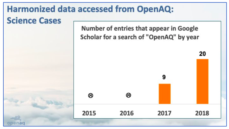 空氣品質監控社群 OpenAQ 在 2018 年獲得了不少成果,在一篇文章中,他們舉出了幾項 2018年的進度重點:提及 OpenAQ 的科學文章從2017年的 9 篇成長到 2018 年的 20 篇;NASA 運用社群資料檢測自己的調查是否精準,並使用相關資料規劃衛星調查;學生使用 OpenAQ 發現全球空氣品質變化的高度一致性;幫助政府將資料開放;提供資料給《華爾街日報》、彭博等知名媒體;建立更大的空氣品質工具庫;作為社運的知識後盾。