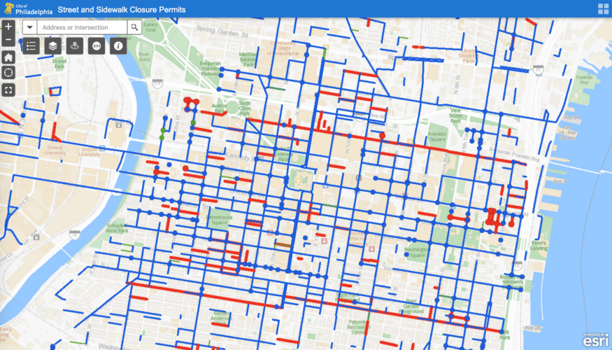 美國費城政府最近公佈了「封路地圖」,讓市民可以即時了解哪些市區街道處在封閉狀態,以及封閉的理由與時段,每三十分鐘就會更新一次。這個地圖原先只是政府機關內部測試使用,但由於去年有大量的開發案必須封路,引起諸多民眾抱怨,讓市政府決定將地圖公開。