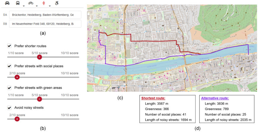 你是否曾經覺得,上學或上班的路途太吵雜、車太多、綠樹太少?德國海德堡大學的「GIScience」研究團隊,最近根據OpenStreetMap的資料,打造出了一套客製化的路程規劃系統。使用者可以依照「綠化程度」(如是否有公園與樹)、「社交場所」(如是否有餐廳或咖啡館)、「安靜程度」(如車流量較少),並給予不同的權重,創造適合自己的通勤路徑。這些路徑可能不是最短的路徑,但經過實測,確實能滿足使用者更多樣的通勤需求。