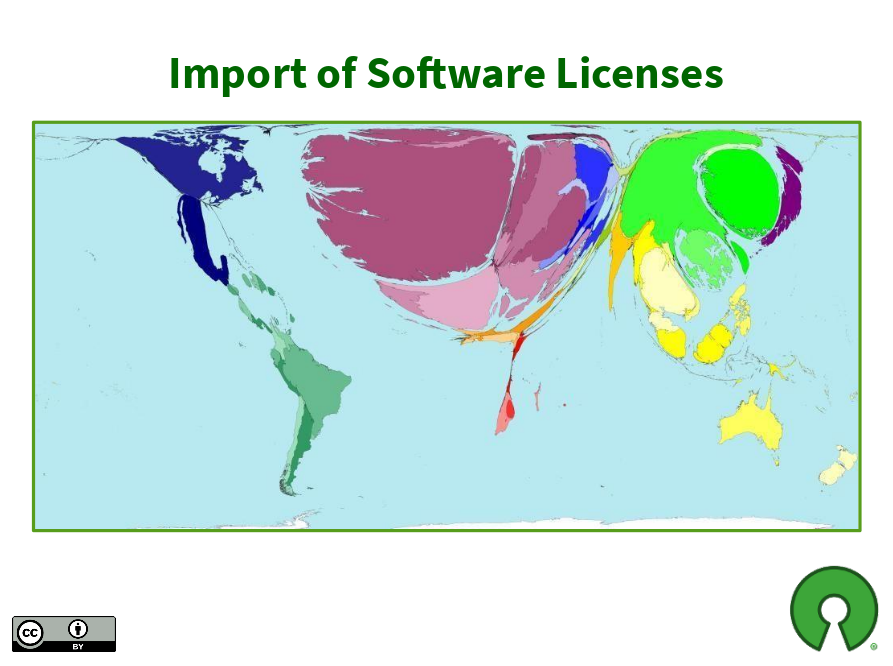 5 月底在日本舉辦的文書軟體 LibreOffice 亞洲研討會,聚焦討論亞洲各國在文件自由的發展。開發 LibreOffice,註冊在德國的「文件基金會」共同創辦人 Italo Vignoli,在簡報中展示了一張地圖:將各國面積依照軟體輸入、輸出的數量膨脹、縮小,結果不出所料——輸出國中,軟體公司林立的美國占了大宗,其他國家大多只剩下一條線;輸入國的地圖,則是幾乎翻轉。