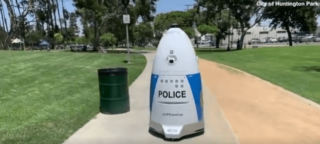 加州洛杉磯郡亨丁頓公園(Huntington Park)警察局,日前花費每年美金 6 萬到 7 萬之間的金額租用名為「HP RoboCop」的蛋形警察機器人,執行日常巡邏工作。但當地居民 Cogo Guebara 日前在公園看到鬥毆,試圖按下巡邏中「HP RoboCop」的求助鈕,「HP RoboCop」卻對 Cogo 大喊「不要擋路」,並且一邊唱歌,一邊叫著「請保持公園乾淨」而離去。最終 Cogo 還是只能用手機撥打 119,待警察到現場處理。