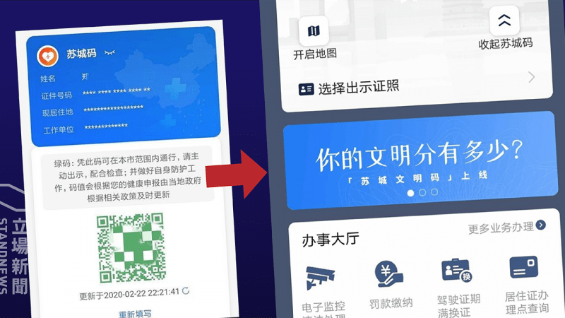 根據《立場新聞》,過去中國各地政府面對 COVID 疫情時,紛紛推出「健康碼」App,只要居民被電腦判定沒有健康風險,就會提供綠色的健康碼儲存在手機中,做為通行許可證在各地之間移動。