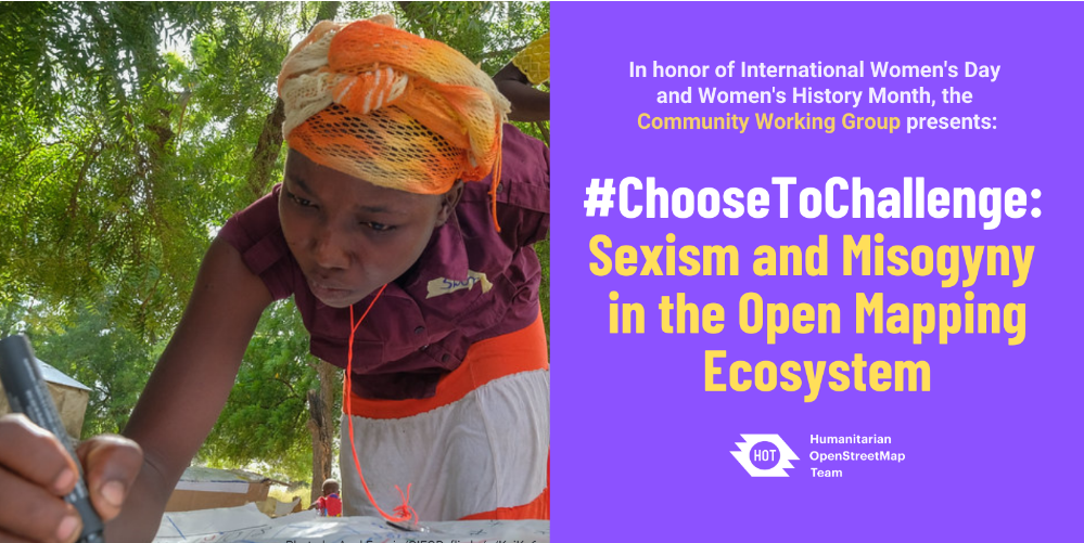 人道開放街圖小組(Humanitarian OpenStreetMap Team)為響應國際女性節與女性歷史月,舉辦了以「挑戰開放地圖社群性別歧視與厭女」為主題的研討會。社群成員認為:要挑戰性別歧視,必須要鼓勵女性參與、領導、聆聽及參與對話,檢視自身行為與偏見,提倡協作而非競爭,了解地方脈絡,戳破(call out)性別歧視的行為,同時避免羞辱行為者。作者指出,男性雖然不是女性,但絕對可以在這場對話中成為女性的盟友。