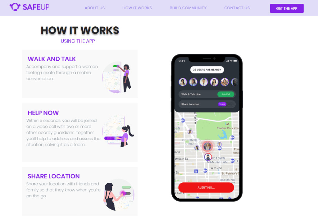 無論臺灣或世界各地,無所不在的性別歧視與父權箝制,使得女性相較男性處於更大的暴力與威脅之中。以色列創業團隊「安全起來」(SafeUp)為了幫助女性,設計出一套 app,使用者下載後可以接受培訓,在鄰近使用者受到暴力威脅並回報時,透過視訊或是實際到場陪伴,幫助對方安全離開現場。為了避免男人搗亂,這套軟體使用視訊驗證,在確認使用者是女性、酷兒或是非二元性別者後,才可以加入社群。
