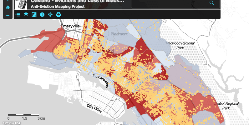 根據「反迫遷地圖計畫」(Anti-Eviction Mapping Project)的資料,2005 至 2015 年,加州奧克蘭發生 32402 起迫遷事件,黑人居住人口則在 2010 至2014 年下降了 4%,這數字背後是美國許多大城市興起的仕紳化(gentrification,亦稱中產階級化)現象,許多房東和物產業者不斷提高租金,甚至針對低收入戶或有色人種,無預警要他們搬離,導致許多人頓時流離失所。「反迫遷地圖計畫」透過以地圖技術為基礎的數據分析,列出這些經常強迫住戶搬離的房東和物產公司名單,給小企業或弱勢租屋者作為參考,以避免遭到迫遷。